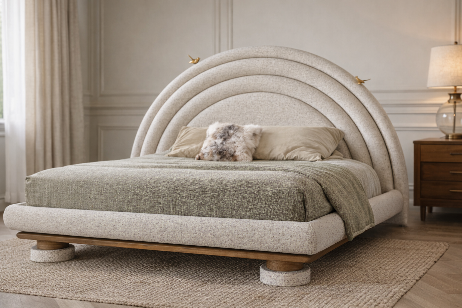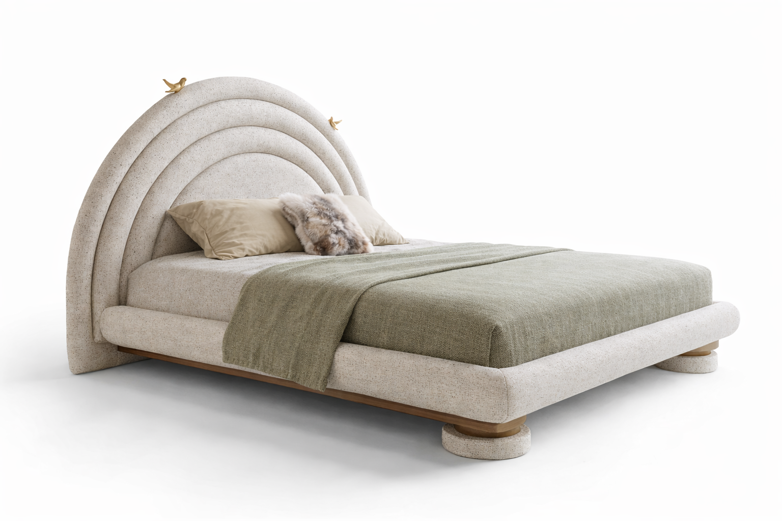 ARCELIA Karyola, katmanlı kemer formuna sahip heykelsi başlık tasarımıyla yatak odası mekânlarında güçlü bir mimari odak noktası oluşturur.