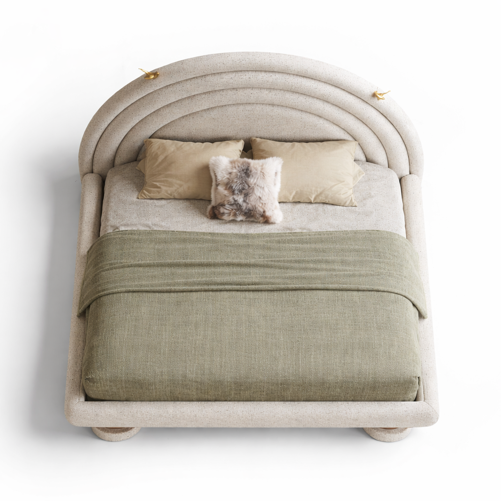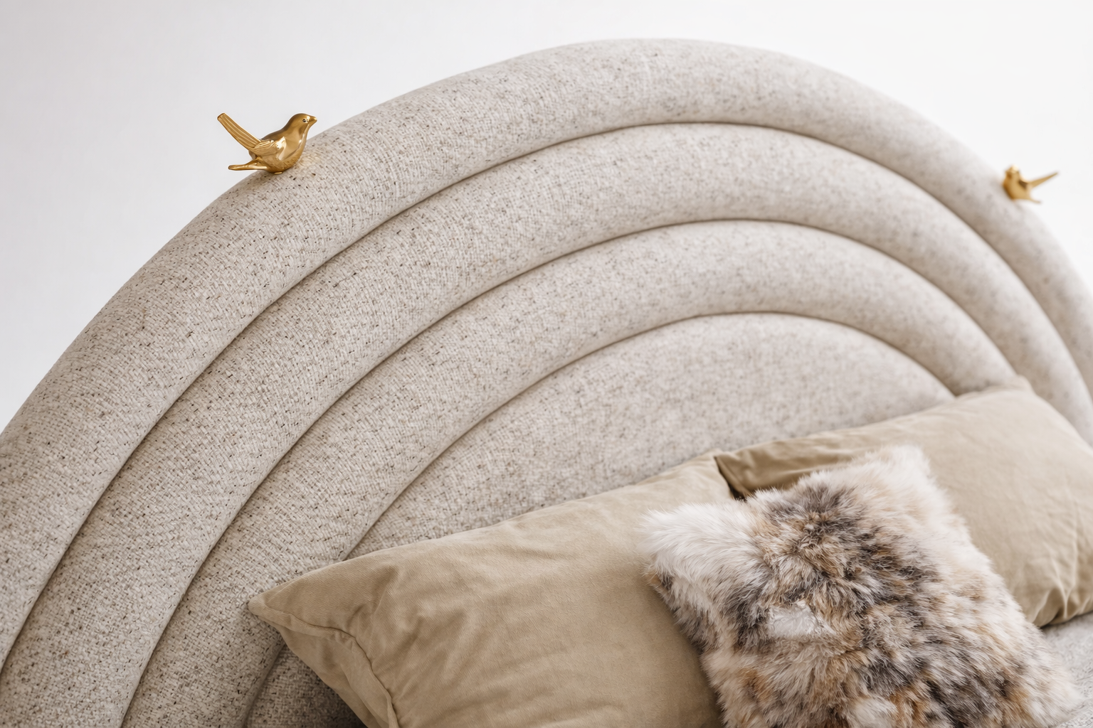 Arka arkaya yükselen kavisli katmanlar, tasarıma derinlik kazandırırken aynı zamanda yumuşak ve davetkâr bir silüet yaratır. Döşemeli yüzeyin dokusal karakteri, modern tasarım dilini sıcak bir atmosferle dengeler.