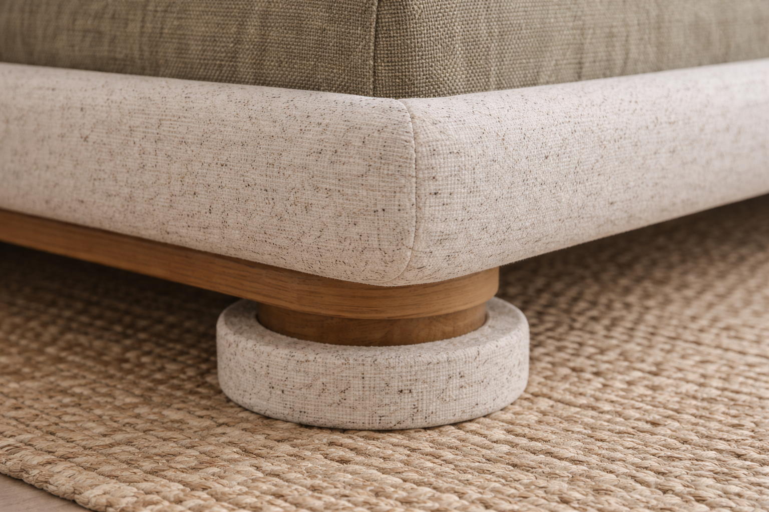 Geniş ve alçak platform formu, yatak çevresinde sakin ve dengeli bir kompozisyon oluşturur. Minimal ayak yapısı ve gövde boyunca devam eden yumuşak hatlar, tasarımın akışkan ve bütüncül görünmesini sağlar.