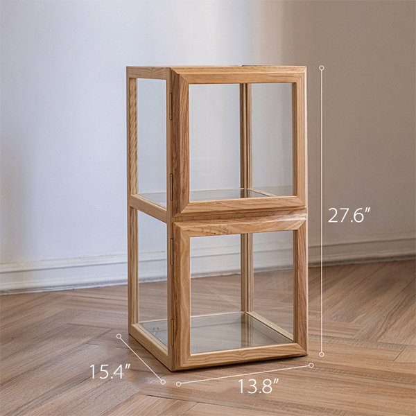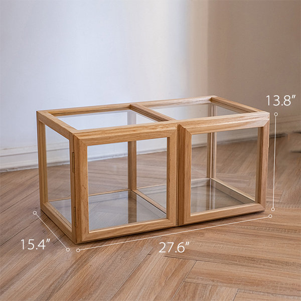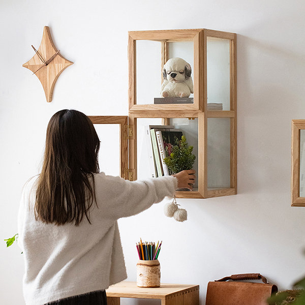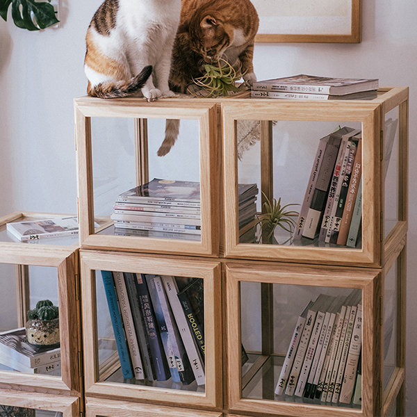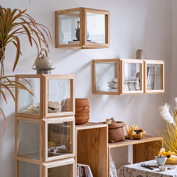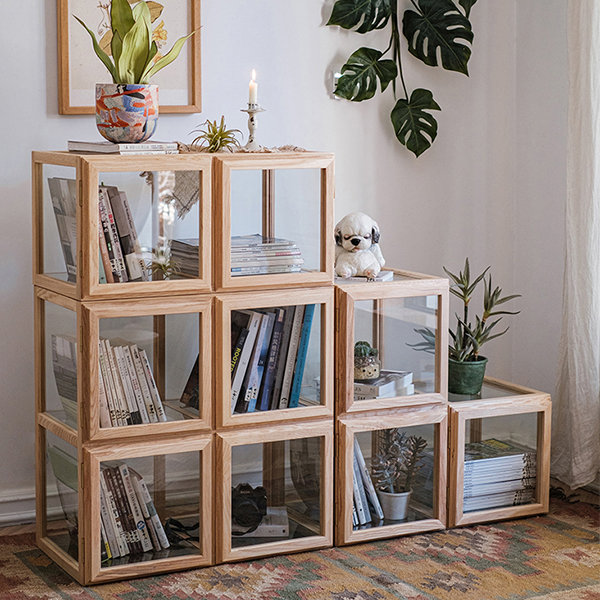 Modüler yapısı sayesinde modüller yatay veya dikey olarak istenilen kompozisyonda kullanılabilir; kitap, bitki, obje ve dergi sergilemek için çok yönlü bir alan oluşturur. Cam yüzeyler iç mekâna ferah ve aydınlık bir görünüm kazandırırken, açık meşe tonları sıcak bir denge sağlar.