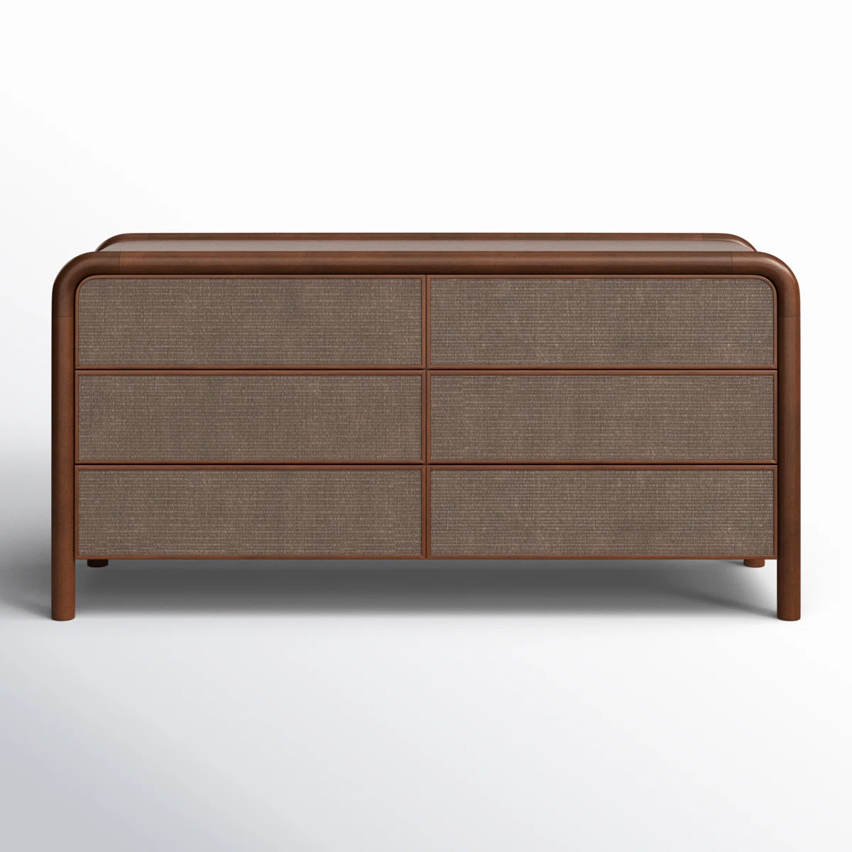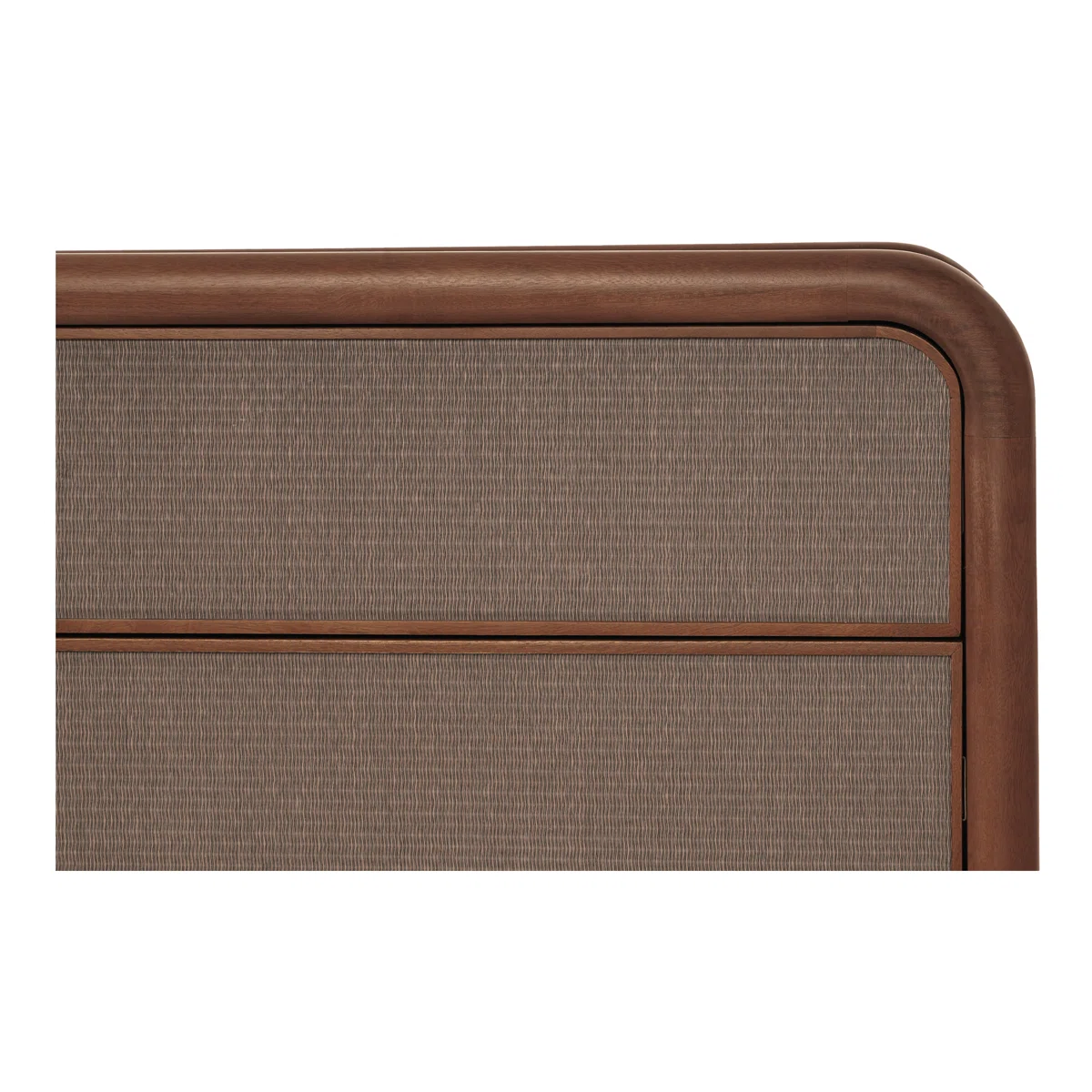 Yuvarlatılmış ceviz çerçeve formu, kumaş kaplama çekmece yüzeyleriyle birleşerek görsel ve dokunsal bir zenginlik yaratır.