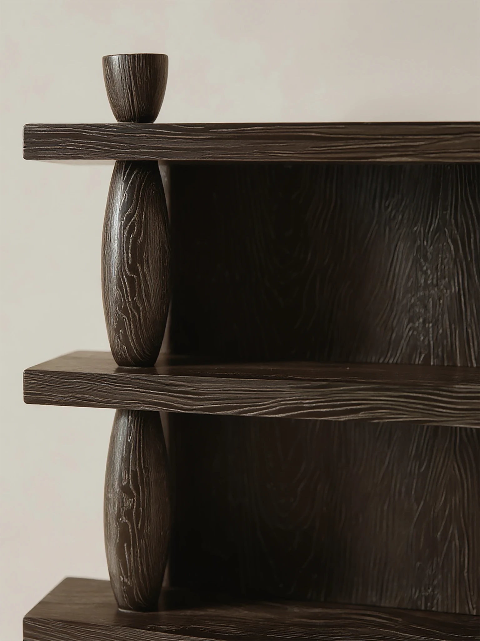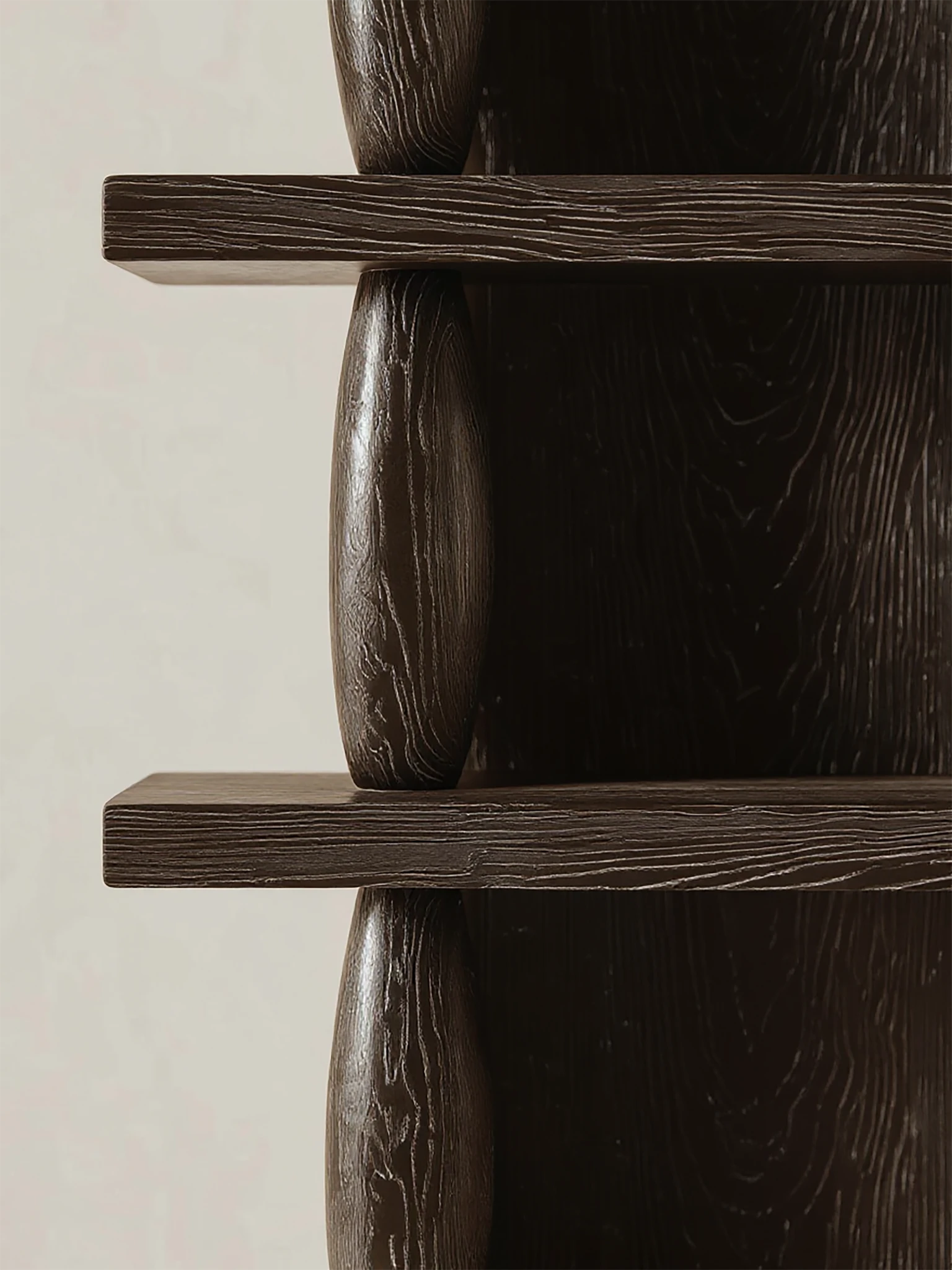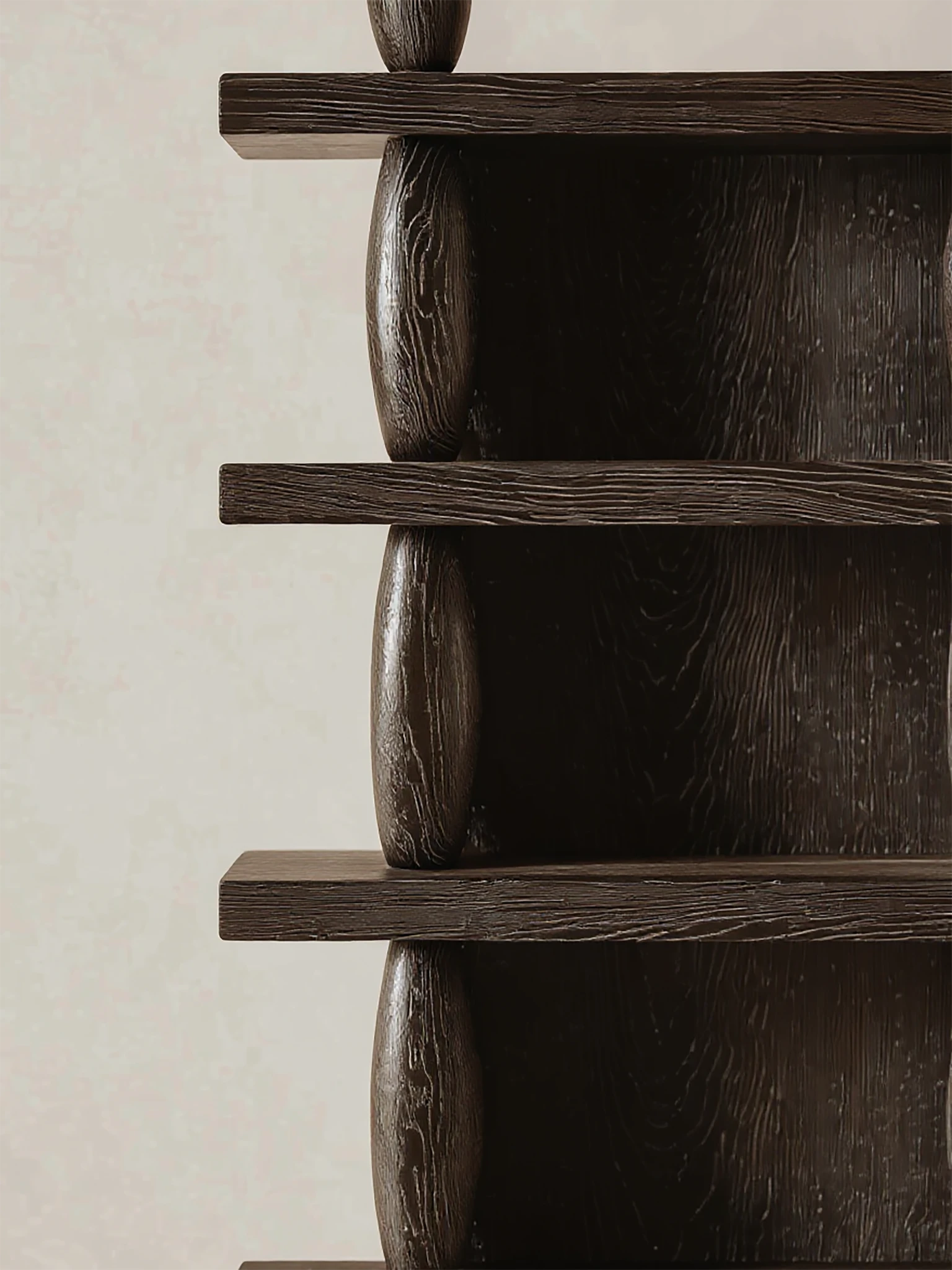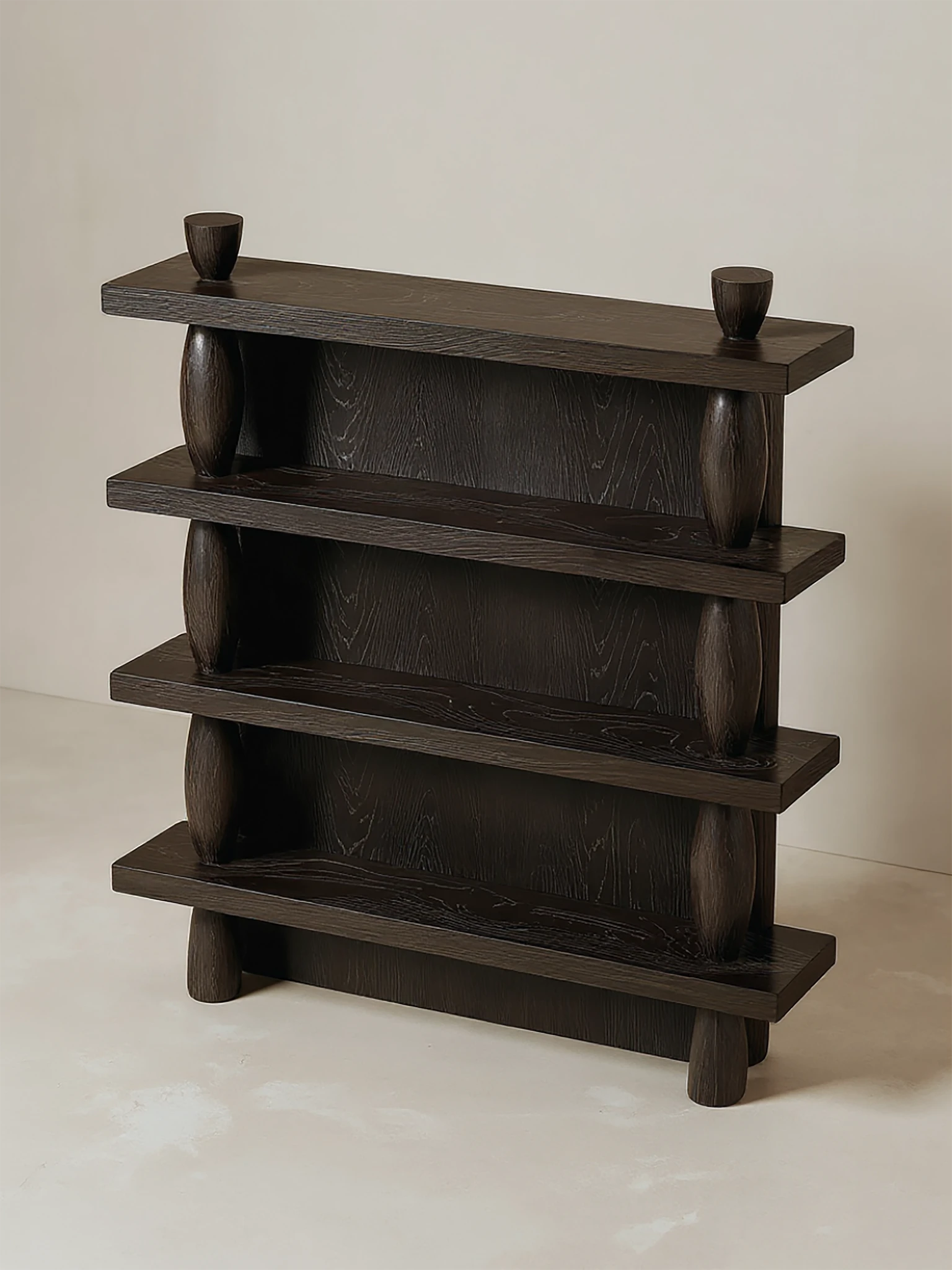 Senasr Kitaplık, masif ahşabın yalın gücünü heykelsi bir dengeyle yorumlayan, mimari bir raf sistemi olarak tasarlanmıştır. Kalın ve net raf plakaları; yumuşak geçişli, tok taşıyıcı ayaklarla birleşerek kitaplığı yalnızca fonksiyonel bir depolama ünitesi olmaktan çıkarır ve mekânın karakterini tanımlayan bir tasarım objesine dönüştürür.