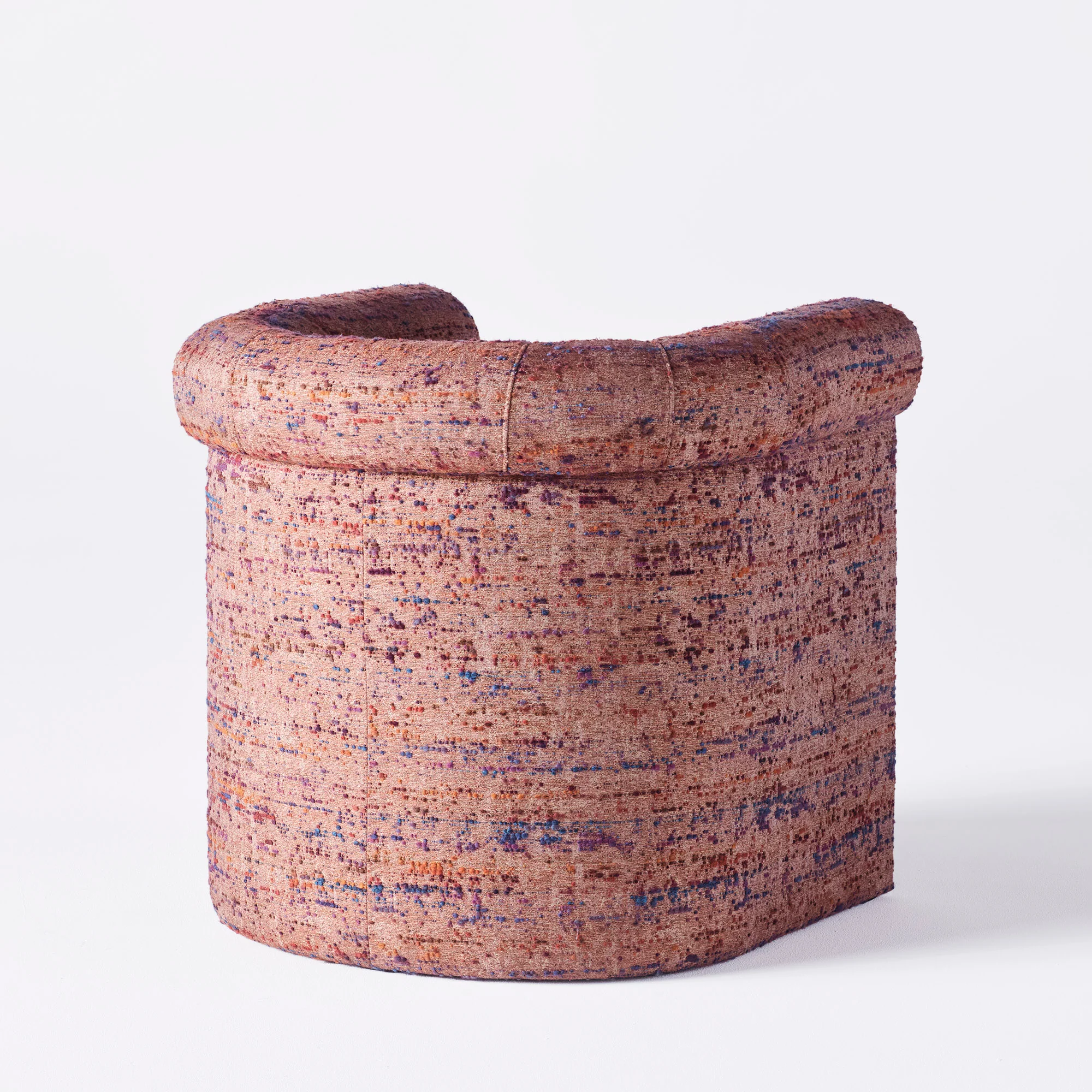 Monoblok formu zemine güçlü bir şekilde otururken; dokulu kumaşın çok renkli yüzeyi parçaya retro–artisanal bir karakter kazandırır.