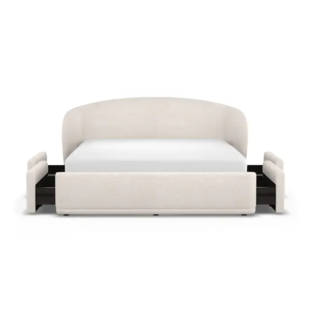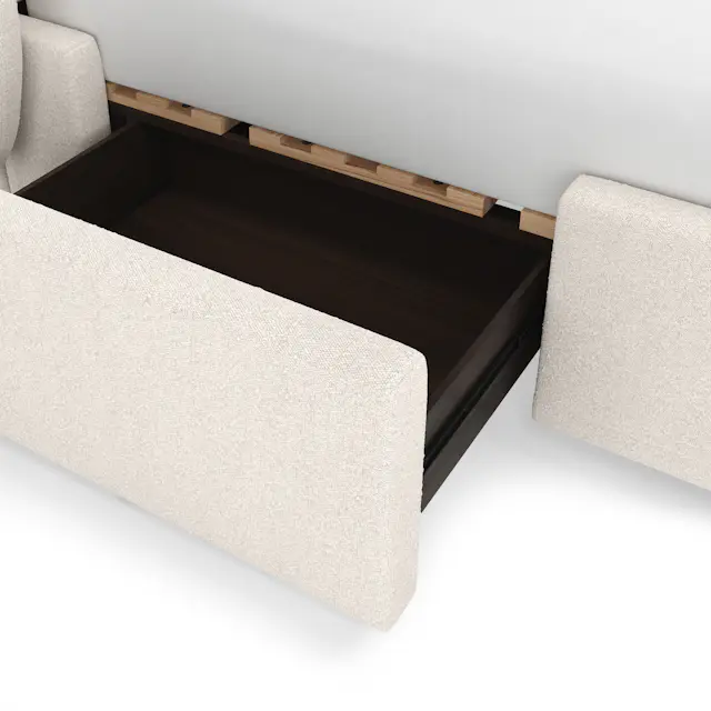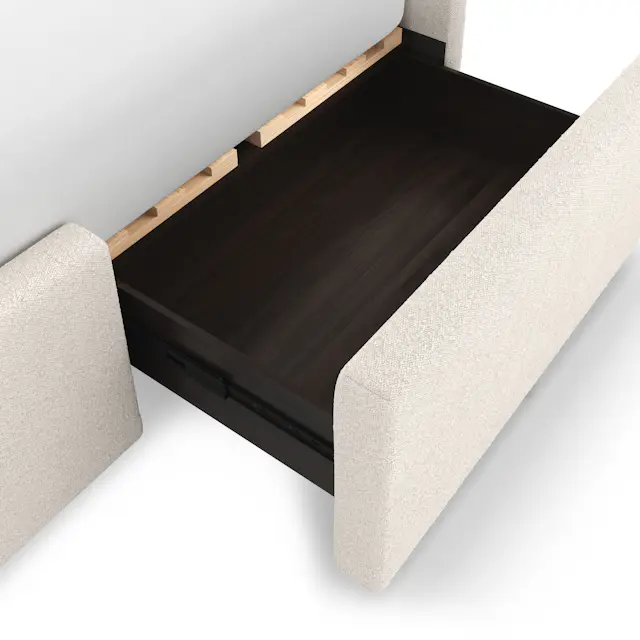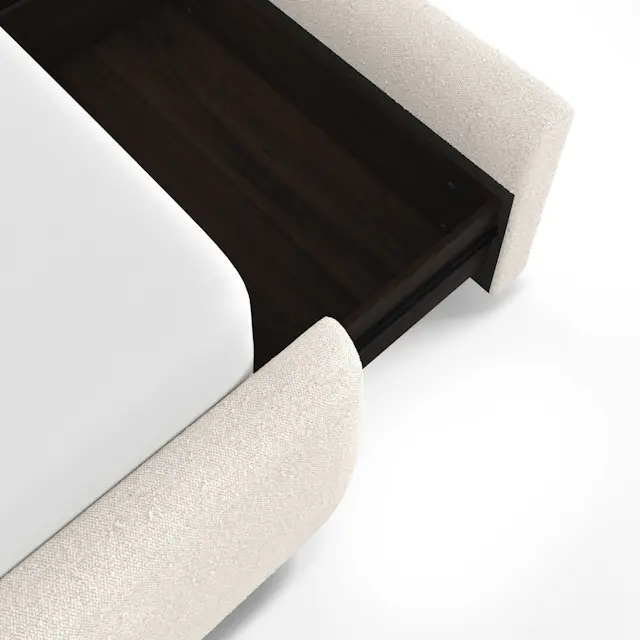 Tenera Karyola, zarif krem kumaş kaplaması ve yumuşak hatlı tasarımıyla yatak odalarına modern bir sadelik ve fonksiyonellik kazandırır. Gövdesine entegre edilen gizli çekmeceler, depolama ihtiyacına akıllı bir çözüm sunarken minimalist formu mekâna ferah bir görünüm katar.