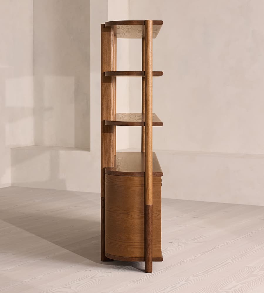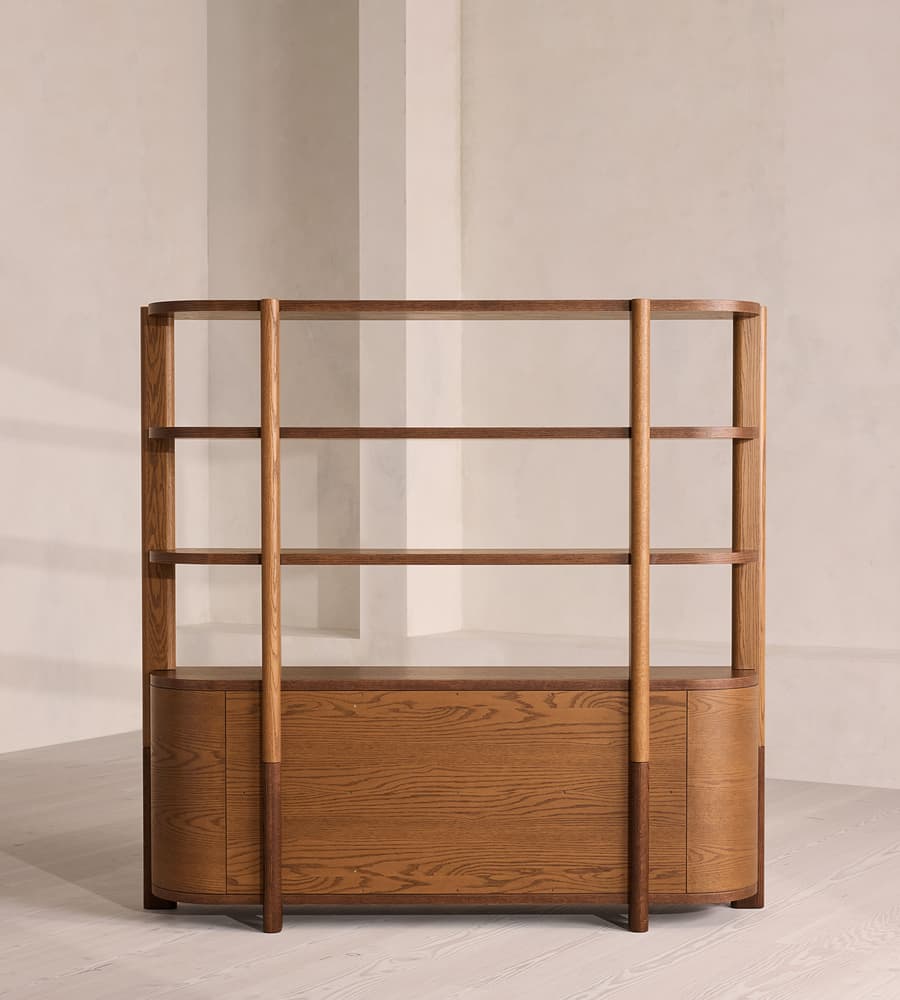 Valdora Kitaplık, organik oyma yüzeyli alt gövdesi ve ince masif raflarıyla hem depolama hem sergileme işlevini bir arada sunan heykelsi bir tasarım parçasıdır. Alt bölümdeki dalga etkili kabartma panel ışıkla birlikte ritmik bir gölge oyunu oluştururken, üst bölümde artırılmış yükseklik hissi yaratan mimari raf sistemi mekâna modern ve doğal bir karakter katar. Valdora, geniş yaşam alanlarından çalışma odalarına kadar her ortamda sofistike bir odak noktasıdır.