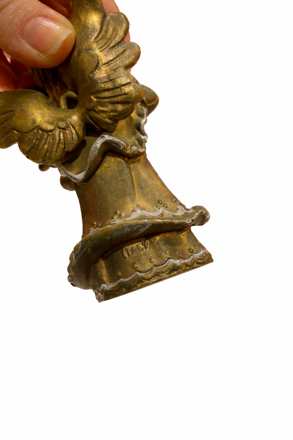 Arka alt bölümde yer alan “ITALY” damgası, objenin İtalyan üretimi olduğunu göstermektedir. Kanat formu, kıvrımlı saç detayları, yumuşak yüz ifadesi ve antik bronz / altın tonlu yüzeyi ile figür; hem dekoratif hem de nostaljik bir karakter taşır.