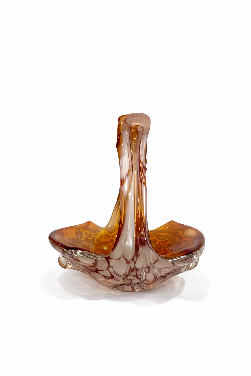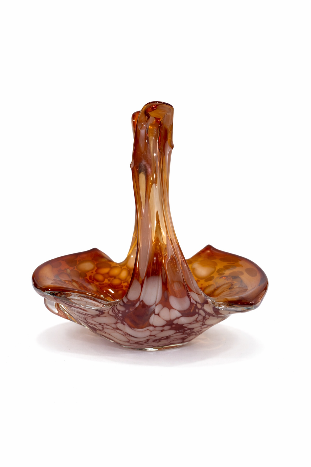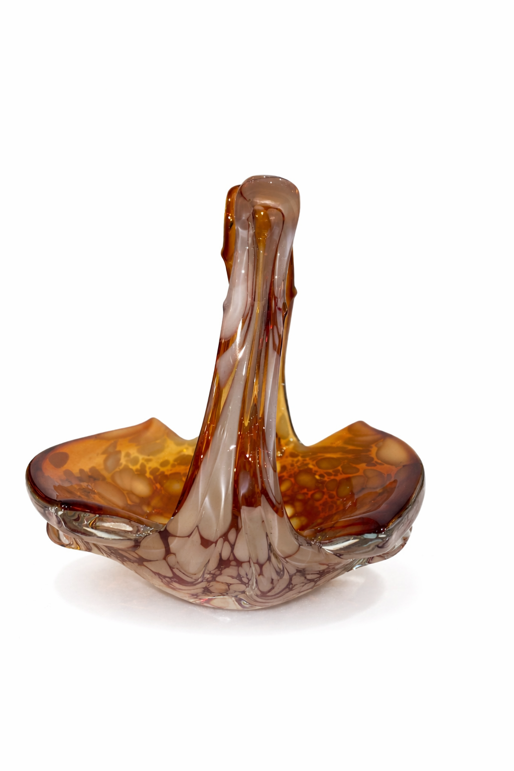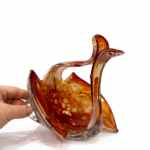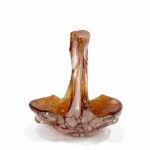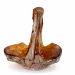 İtalyan cam sanatının dekoratif ve zarif örneklerinden biri olan bu Vintage Murano cam sepet, sıcak amber / kehribar tonları, opalin beyaz benekli geçişleri ve tamamen el işçiliğini hissettiren organik formuyla dikkat çeken özel bir dekoratif objedir.