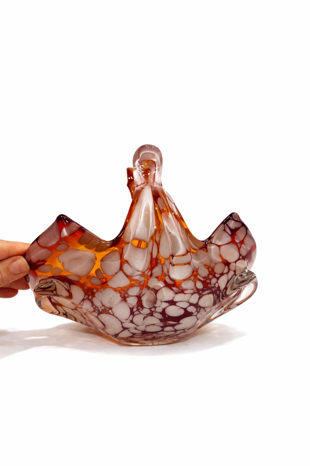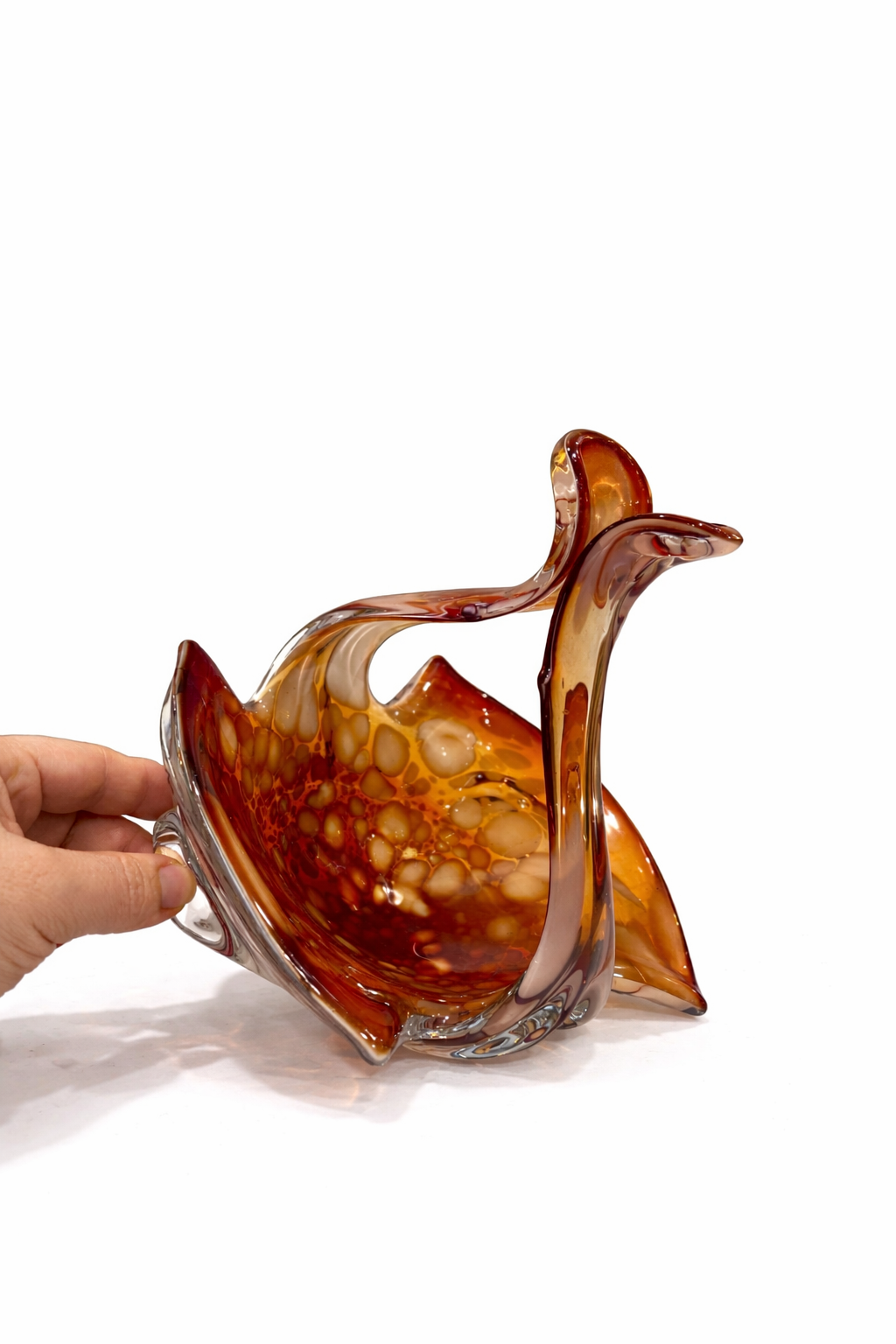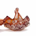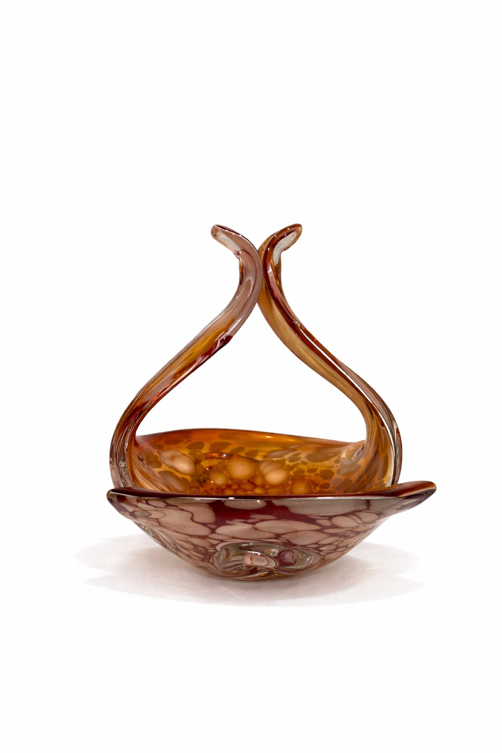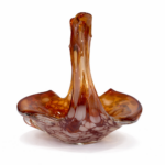 İtalyan cam sanatının dekoratif ve zarif örneklerinden biri olan bu Vintage Murano cam sepet, sıcak amber / kehribar tonları, opalin beyaz benekli geçişleri ve tamamen el işçiliğini hissettiren organik formuyla dikkat çeken özel bir dekoratif objedir.